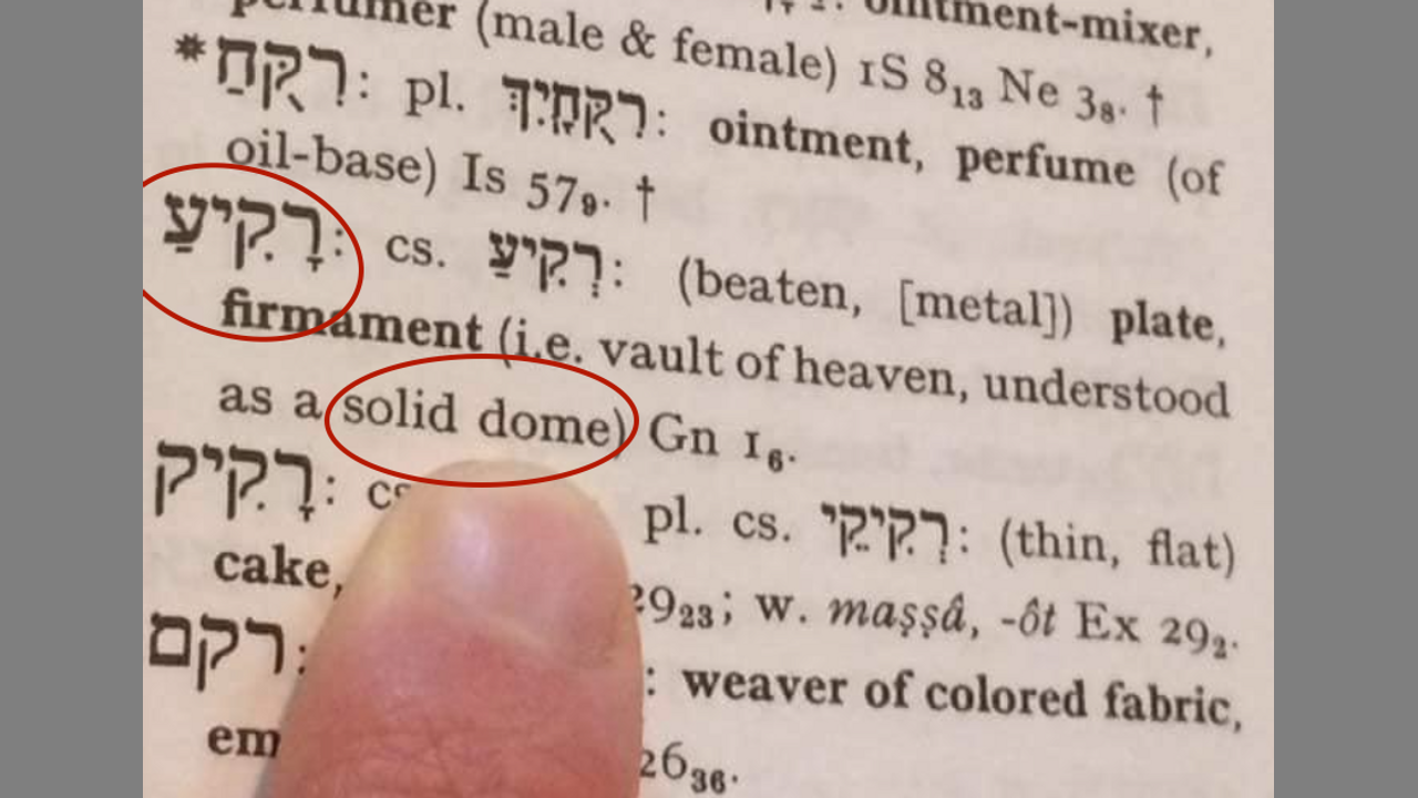 The word “firmament” is used to translate raqia, or raqiya` (raki’a), a word used in Biblical Hebrew. It is derived from the root raqa, meaning “to beat or spread out”, e.g., the process of making a dish by hammering thin a lump of metal. Firmament from the Vulgate firmamentum, which is used as the translation of the Hebrew raki’a . This word means “expansion.” It denotes the space or expanse like an arch appearing immediately above us. They who rendered raki’a by firmamentum regarded it as a solid body. We read of the sun rising and setting and the use of this particular word. It is plain that it was used to denote solidity as well as expansion. It formed a division between the waters above and the waters below (Genesis 1:7). The raki’a supported the upper reservoir of water(Psalms 148:4). It was the support also of the heavenly bodies (Genesis 1:14) and is spoken of as having “windows” and “doors” (Genesis 7:11, Isaiah 24:18, Malachi 3:10) through which the rain and snow might descend.