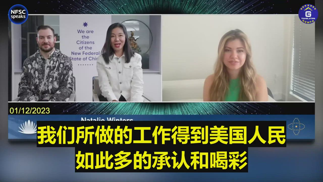 01/12/2023 Natalie Winters: It's really inspiring to see so many Americans buying into the cause of taking down the Chinese Communist Party and getting involved. The New Federal State of China has been doing great work and is really spreading the word, and I'm honored to help you do that.