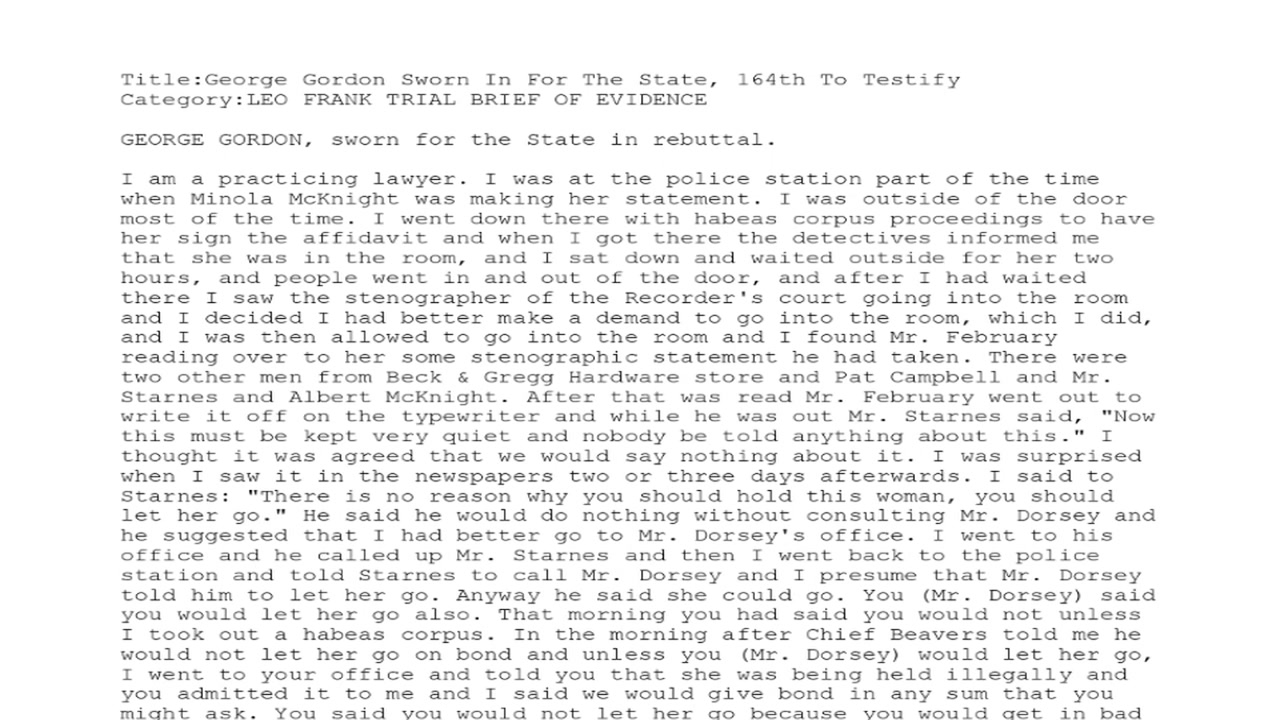 I am a practicing lawyer. I was at the police station part of the time when Minola Mc Knight was making her statement. I was outside of the door most of the time. I went down there with habeas corpus proceedings to have her sign the affidavit and when I got there the detectives informed me that she was in the room, and I sat down and waited outside for her two hours, and people went in and out of the door, and after I had waited there I saw the stenographer of the Recorder's court going into the room and I decided I had better make a demand to go into the room, which I did, and I was then allowed to go into the room and I found Mr. February reading over to her some stenographic statement he had taken. There were two other men from Beck & Gregg Hardware store and Pat Campbell and Mr. Starnes and Albert Mc Knight. After that was read Mr. February went out to write it off on the typewriter and while he was out Mr. Starnes said, "Now this must be kept very quiet and nobody be told anything about this." I thought it was agreed that we would say nothing about it. I was surprised when I saw it in the newspapers two or three days afterwards. I said to Starnes: "There is no reason why you should hold this woman, you should let her go." He said he would do nothing without consulting Mr. Dorsey and he suggested that I had better go to Mr. Dorsey's office. I went to his office and he called up Mr. Starnes and then I went back to the police station and told Starnes to call Mr. Dorsey and I presume that Mr. Dorsey told him to let her go. Anyway he said she could go. You (Mr. Dorsey) said you would let her go also. That morning you had said you would not unless I took out a habeas corpus. In the morning after Chief Beavers told me he would not let her go on bond and unless you (Mr. Dorsey) would let her go, I went to your office and told you that she was being held illegally and you admitted it to me and I said we would give bond in any sum that you might ask. You said you would not let her go because you would get in bad with the detectives, and you advised me to take out a habeas corpus, which I did. The detectives said they couldn't let her go without your consent. You said you didn't have anything to do with locking her up.
