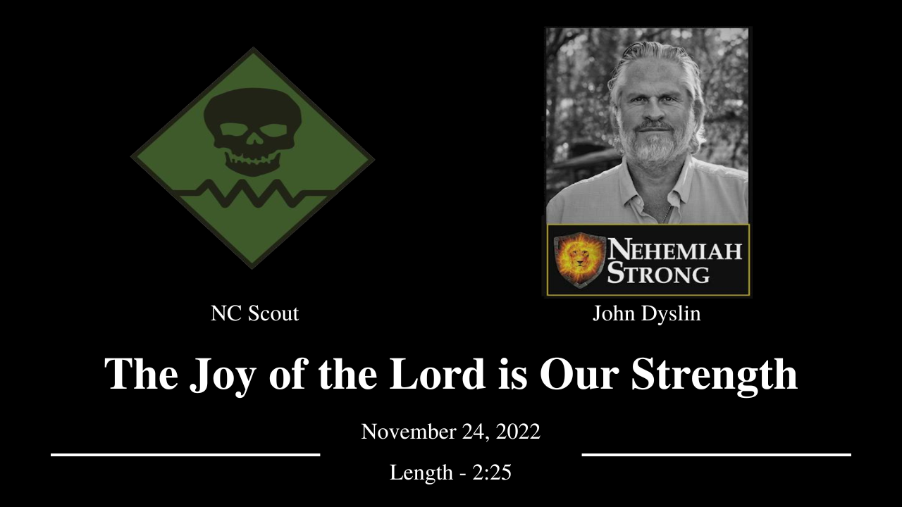 In this video John Dyslin, author of Nehemiah Strong, speaks with NC Scout, the senior leader of American Partisan. John discusses Nehemiah 8:10, which says, “The joy of the Lord is your strength.” The enemy wants to steal our joy, so we must double down on our focus and commitment to joy that we might fight back with joyfulness in our hearts.