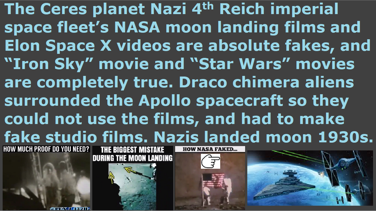 *** Intelligence news update from the Human Homo-Sapiens Race Survival Resistance (HRSR) headquarters and Republic Rebel Alliance battlefront (October 2021). The Ceres planet Nazi 4th Reich imperial space fleet’s NASA moon landing films and Elon Musk’s Space X videos are absolute fakes, and the “Iron Sky” movie and “Star Wars” movies are completely true. There are hundreds of fallen angel alien and nephilim & chimera alien bases on the moon (truce zone), and thousands of Rockefeller family owned Nazi and Rothschild family owned U.S. Navy and Illuminati Satanist multi-corporation owned ICC (International Corporate Conglomerate) space fleets and cities on thousands of planets throughout the universe, as the Illuminati shows you in their “Star Wars” movies. The Illuminati 501c3 church pastors are hired shills there to hide all this information, and the children’s adrenochrome blood harvesting farms & child sex slave brothels on many planets, and the 8 million children CPS-kidnapped & MILAB-abducted every year, from God’s spiritual army, either because they are pedophile cannibal Satanist Draco reptilian chimera alien incarnate avatar “gay mafia elite” church pastors, or they are cowardly traitor human church pastors who are afraid of getting assassinated by the nephilim & chimera elites, and ridiculed by their church donators and book customers and Christian ministry business customers. They had to fake the moon landing films because the Dracos and their spaceships surrounded the Apollo spacecraft that landed on the moon and they could not broadcast that, so the Illuminati elites asked their Satanist movie director Stanley Kubrick to make fake moon landing films. The Apollo rockets are fake, and they used antigravity spaceship technology that has been used since the 1800s Sonora Aero Club and the 1800s Tartaria civilization that was on earth which they erased from history after genocide exterminating the human population and indoctrinating pedophilia orphans that survived and erasing all records, as they show you very clearly in their movie “The Golden Compass.”