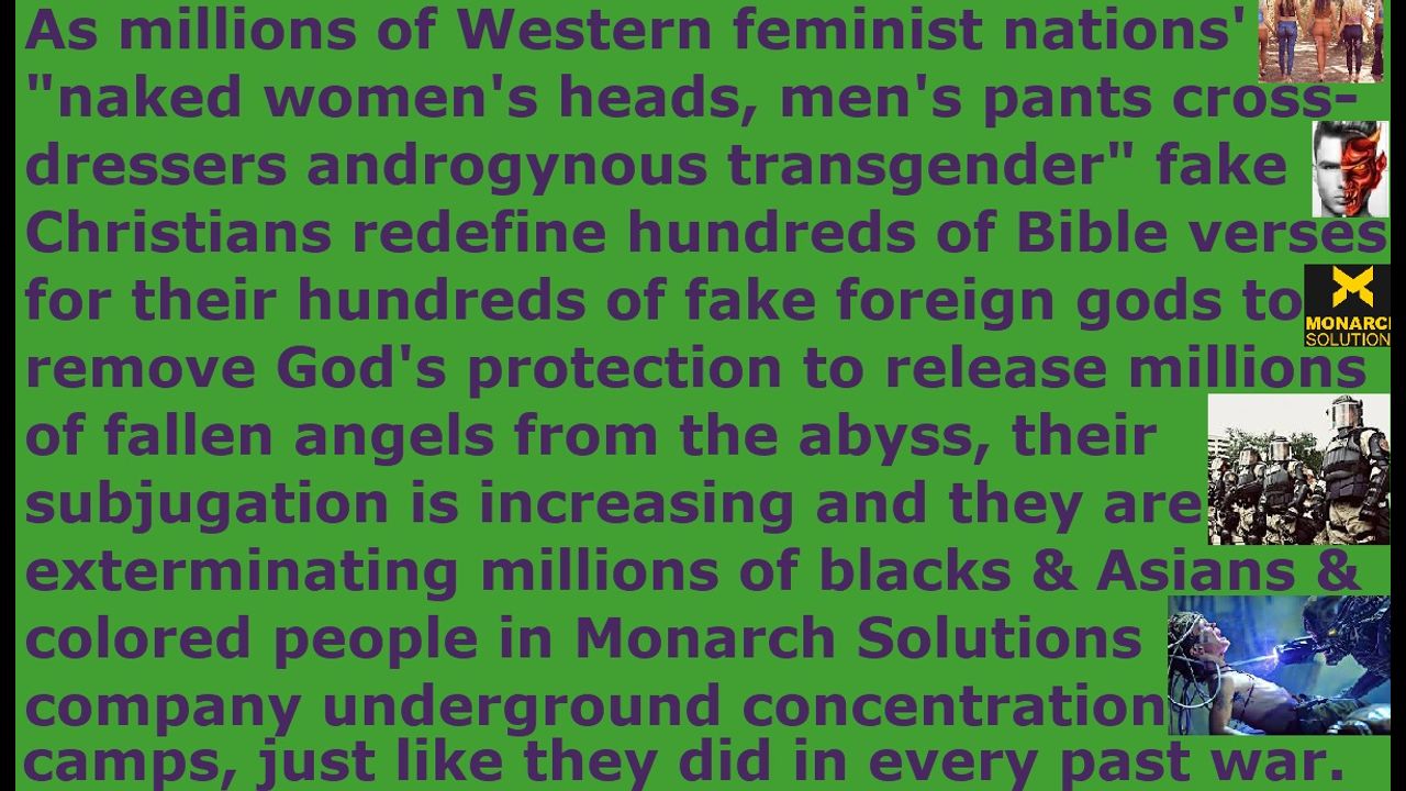 *** Intelligence news update from the Human Homo-Sapiens Race Survival Resistance (HRSR) headquarters and Republic Rebel Alliance battlefront (February 2025). As millions of Western feminist nations' "Bible verses redefining, women’s head coverings rebelling, fallen angel head controlled, men's pants cross-dressers androgynous transgender" fake Christians redefine hundreds of Bible verses for their hundreds of fake foreign gods to remove God's protection to release millions of fallen angels from the abyss, their subjugation by the fallen angels is increasing and fallen angels are exterminating millions of blacks & Asians & Hispanics & native indigenous & colored people in Monarch Solutions corporation & Umbrella corporation FEMA DARPA underground concentration labor camps, just like they did in every past war. Satan Lucifer’s Draco reptilian chimera fake alien incarnate avatar pedophile cannibal Satanist earth’s hidden matriarchal rulers “lesbian sisterhood coven witch feminists” globalist elites collect human meat supplies & livestock people & hybrid breeders & laboratory biochemical weapon test subjects & organ harvesting products & torture entertainment children to feed the fallen angels their parasitical human soul energy through terror & pain & sorrow & hatred & despair & war & disease & divorce & war crimes & terrorism & natural disasters, and adrenochrome tortured children’s blood since the Bible says the human soul life is in the blood, because their fallen angel bosses are cut off from God’s life source energy light. They receive in exchange from their fallen angel bosses for the 12 million child sacrifice torture Satanist rituals both wealth & popularity & witchcraft occult knowledge & power & high positions in society managing the front façade visible male “gay mafia brotherhood elites” servants to manage the child-trafficking rings food industry for the fallen angels. The “Twilight Saga” fallen angels vampire devils are alienated from God, so they are “red shift” dying by moving into the infrared light and need to feed on the humans’ souls. These fake Christians feed the fallen angels soul energy by their sins & evils & rebellion & idolatry & Jezebel demon-possession & over 50% to 80% divorce rate of Christian communities in their Western feminist nations’ millions of Satan Lucifer’s churches, which are the headquarters of the world’s witchcraft, more than Africa & Southeast Asia combined. This is why when all these hordes of Draco avatar pedophile cannibal Satanist New Age Wicca witch occult esoteric spiritualist theosophical hybrid demon spirit empty shell mouthpiece puppet people, who are demon-possessed by their fallen angel necromancy spirit guide channeling higher-selves Christ-consciousness higher-consciousness Satan Lucifer, who receive a lot of publicity on the internet, say that all the evil Draco avatar Satanist elites are being arrested and the Draco avatar pedophile cannibal Satanist Donald Trump & Elon Musk & QAnon & the fictitious White Hats are arresting themselves and putting all their own Draco avatar Satanist elites into prison and stopping the child-trafficking rings, they are lying. If what they are claiming is true, they would not be trying to assassinate & starve & infect & censor & manipulate & cripple & kill the families & silence us real Christian samurai warriors of Christ every day, who are speaking out the tens of thousands of truths every day for decades to deny them human authority permission to do all their evils and cause nuclear war to kill off the millions of fake Christians who betrayed us like dirty family dogs to save their own lives from getting cooked alive by CIA microwave oven weapons from next door homes & every hotel room. They have replaced 33% of the Western feminist nations’ population already with non-humans. These fake Christians are giving the devil and his fallen angel permission for all of this to go on by their human authority condoning by silence as fake “Bible’s watchmen on the wall.”