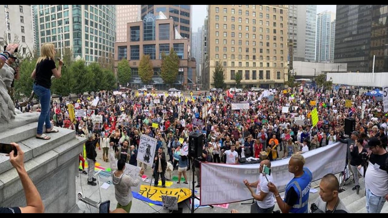 A huge crowd turned out in Vancouver, British Columbia CANADA to show their rejection of the current Covid Caper. Voicing strong disgust for the forced masking, lockdowns and coming vaccine this crowd of usually sedate Canadians demonstrate they have been pushed as far as they will tolerate. Calling for and end to masking and forced economic destruction the crowd irrupted in a TRUMP TRUMP TRUMP chant as a speaker expressed her love for the beleaguered President.