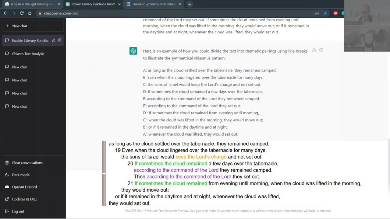 I've engaged the Open AI Chat GPT in a few conversations recently. I've been exploring the potential for helping me analyze or refine or discover linguistic patterns in the biblical text. Mixed results. Very. The process is not without its amusing moments! In this video, we engage the chatbot in another conversation on the subject of chiasmus, featuring two very specific exercises.