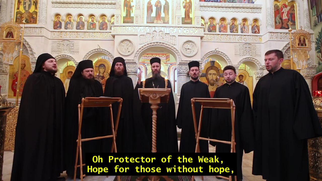 The original melody to this hymn was composed by an Athonite hymnographer who is said to also have had a vision of the Virgin Mary prior to composing the work. The recording of this melody by the Monks of Simonopetra has contributed significantly to the popularization of the hymn.