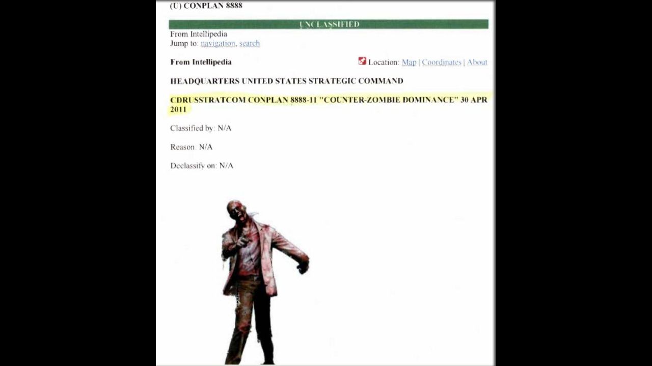 "CONOP 8888 also known as Counter-Zombie Dominance is a U.S. Department of Defense Strategic Command CONOP document that describes a plan for defending against zombies. The April 30, 2011 document depicts fictional scenarios of zombie attacks as a means of training students in military planning." — Wikipedia