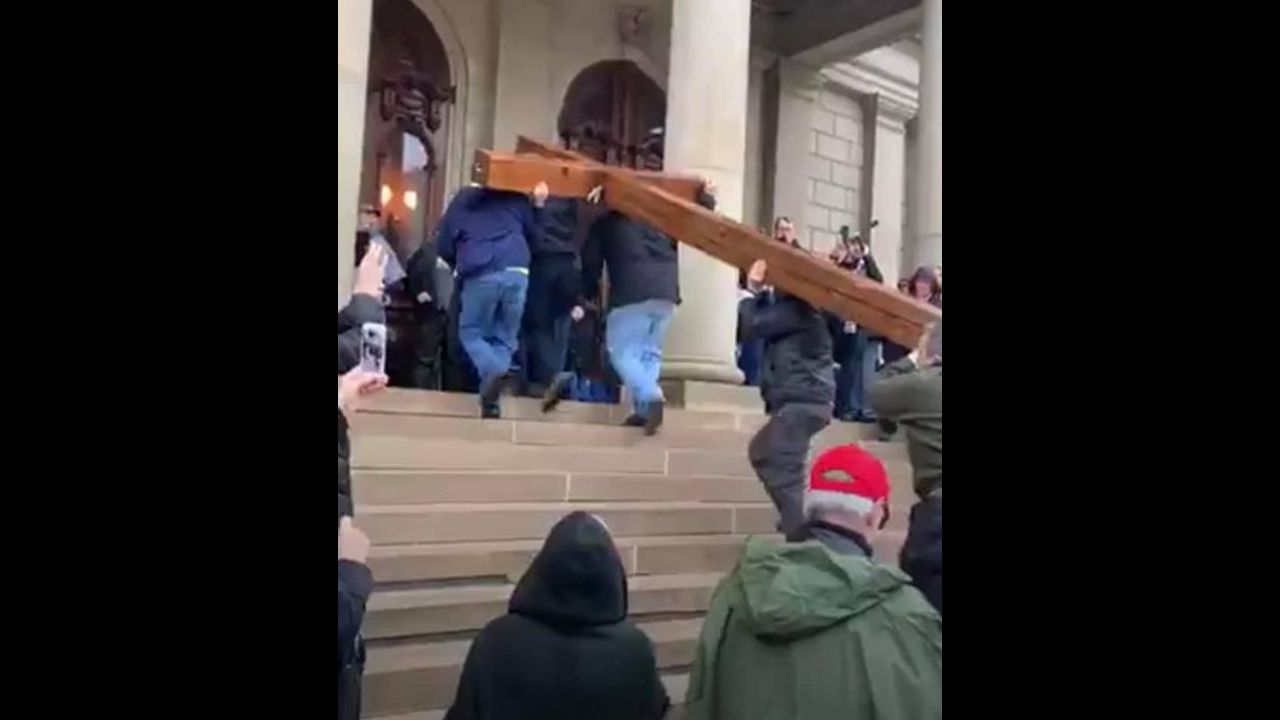 The Cross makes its return to and erected the third time on the MI Capitol Yard on January 6, 2021 Video from the interstate to erection