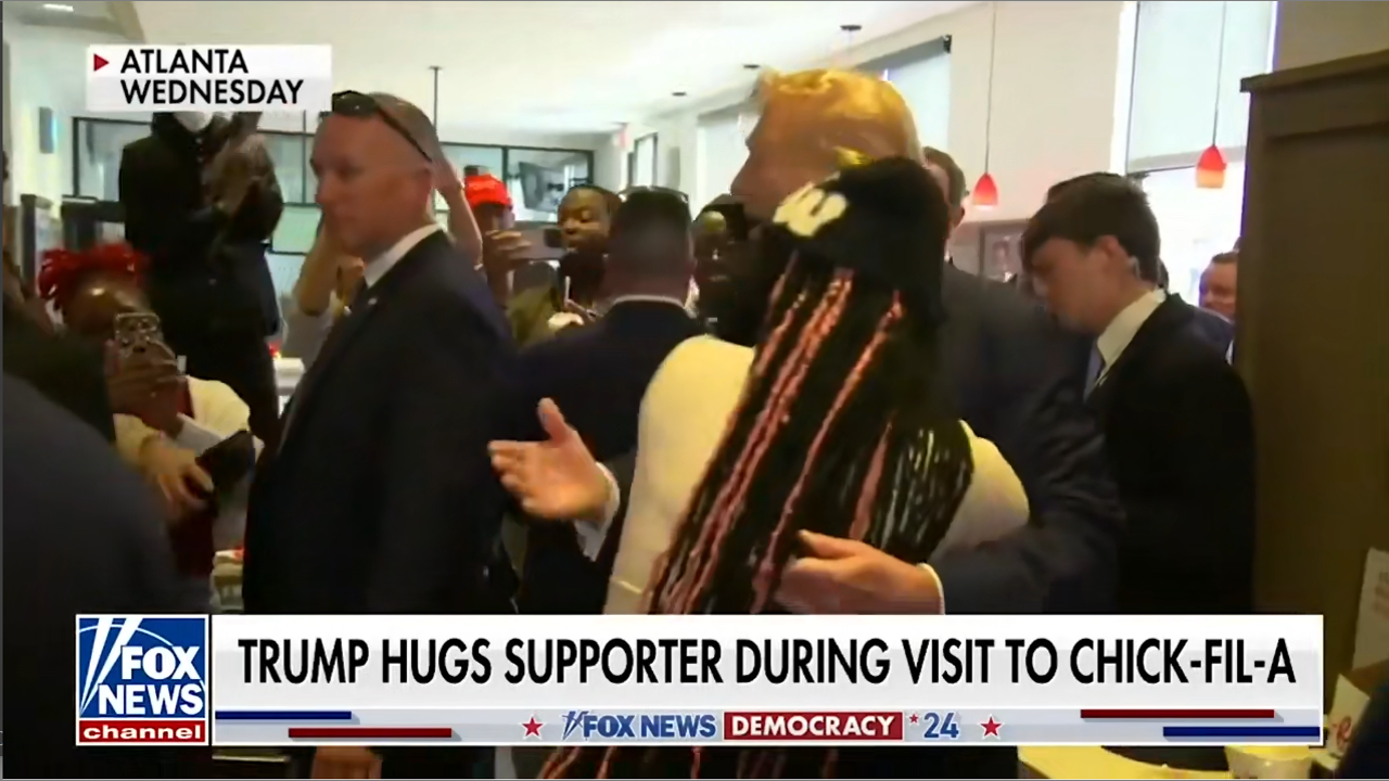 Former President Trump Visits Chick-fil-A. Hugs black activist while there. Positively proves that he isn't racist. On FOX News, she bemoans that the MSM pushes a false narrative about the black community not supporting President Trump.