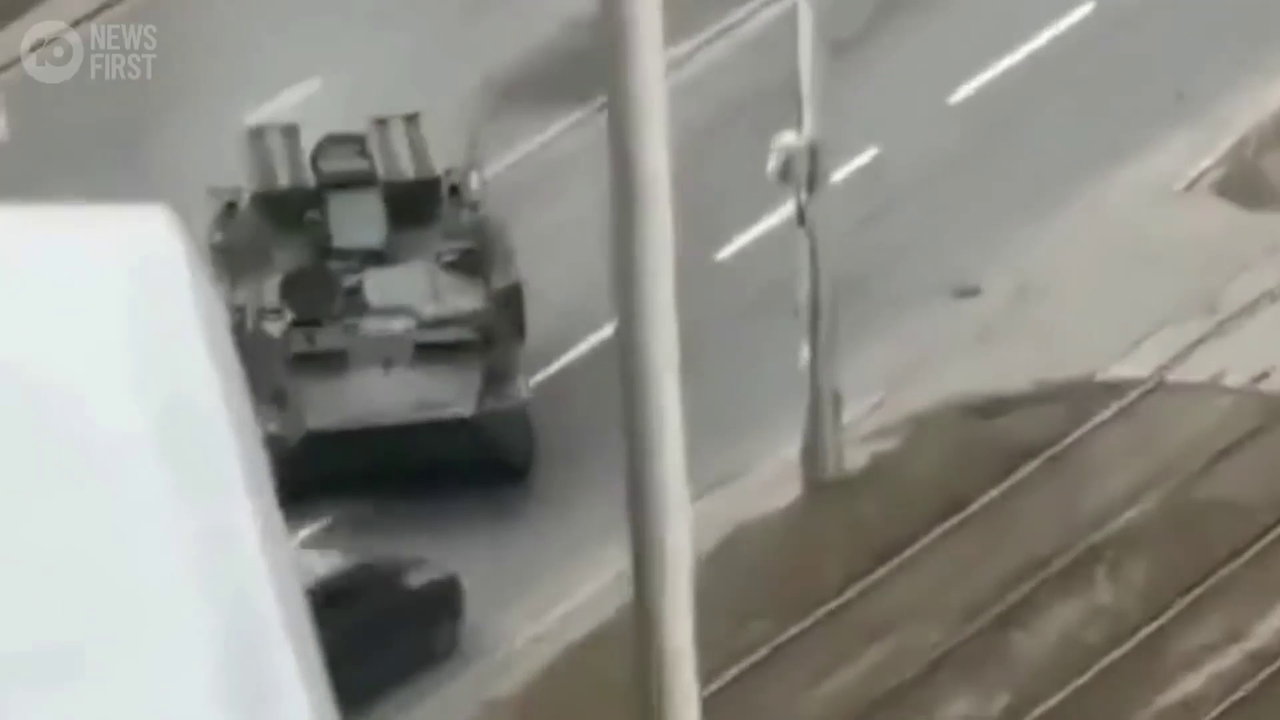 Russian tank takes out car in Ukraine .