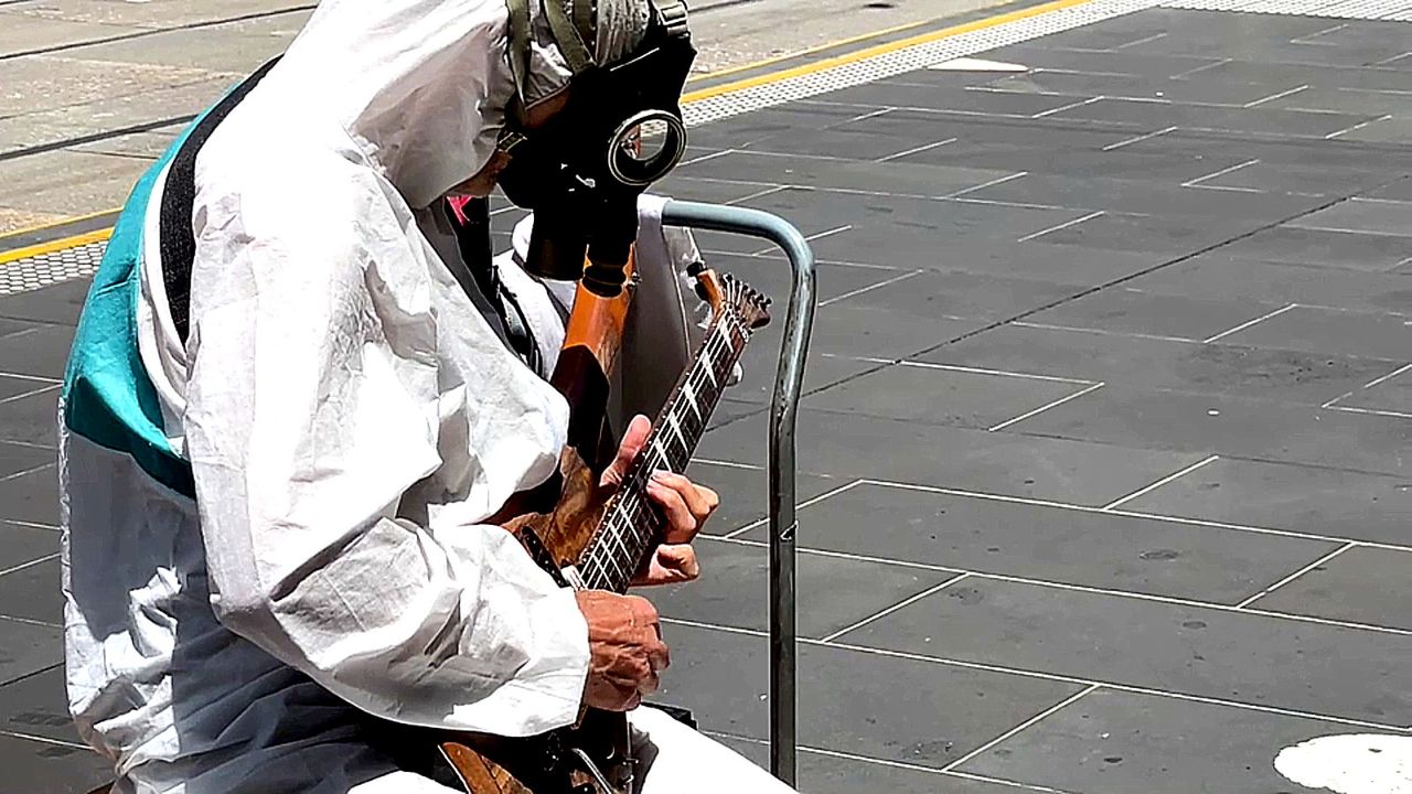 Whenever Mike plays at our end of the Bourke Street Mall, a lot of shoppers stop to watch and get out their phones to video him. He adds to his masterful electric guitar finger-work a layer of mystery by wearing the military gas mask. Street photographers gravitate to images like that, and electric guitar buffs gravitate to enjoy his music.