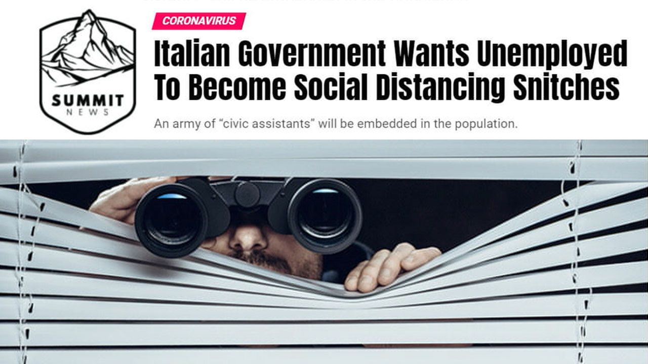 The Italian government announced intentions Sunday to create an army of social distancing snitches, saying it will recruit 60,000 people to monitor their friends and neighbours’ activities and make sure they are adhering to social distancing policies.