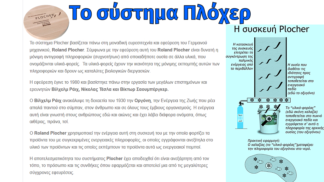 Ο Γερμανός ερευνητής Ρόλαντ Πλόχερ, έγινε γνωστός μέσα στην δεκαετία του '80, όταν άρχισε να πειραματίζεται επιτυχώς με την αναζωογόνηση του νερού, βιολογικά νεκρών λιμνών. Για να το πετύχει αυτό, συνδύασε πρότερες γνώσεις, ανακαλύψεις και εφευρέσεις των Βίλχελμ Ράιχ, Βίκτωρ Σαουμπέργκερ και Νίκολας Τέσλα. Σταδιακά γενίκευσε την εφεύρεσή του, ώστε να βρίσκει εφαρμογή και σε οικιακό περιβάλλον με τους λεγόμενους "ενεργοποιητές" νερού, ποτών και τροφών.