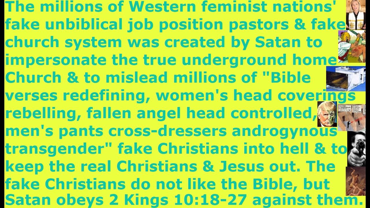 *** Intelligence news update from the Human Homo-Sapiens Race Survival Resistance (HRSR) headquarters and Republic Rebel Alliance battlefront (August 2025). Dear brethren, warn all your church donators that the Nicolaitan clergy class laity class Satanist pagan religious system’s “ordained & allowed & trained & non-assassination-attempts-receiving” fake unbiblical job position pastors and Satanist Christian church system world witchcraft headquarter Christian churches were created by Satan Lucifer to impersonate the true home underground Church and to mislead into hell millions of Western feminist nations’ “Bible verses redefining, women’s head coverings rebelling, fallen angel head controlled, men’s pants cross-dressers androgynous transgender God’s-Word-mockers” fake Christians, who they flooded their millions of churches with by using their hundreds of redefined Bible verses’ hundreds of fake foreign gods, who they use to keep the real Christians and Jesus out. Dear brethren, warn all your church donators that one of the signs to look for when identifying these Satan Lucifer’s millions of pre-1941 “The Plan’s” Bible prophecy rapture billion dollar industry’s YouTube disinformation deceiving distracting diverting deluding Draco reptilian chimera fake alien incarnate avatar pedophile cannibal Satanist New Age “Noah’s days nephilim civilization fallen angel Atlantis old religion” occult spiritualist witchcraft reptilian secret societies fake Christians is their phrase that they always use, “Do not be like I’m holier than thou.” They will not expose the tens of thousands of truths that we real Christians shared & warned & exposed & informed in our daily sermons for decades every day, while receiving assassination attempts every day, without sleeping or eating or bathing or marrying or looking for work to cover our own living costs. They will not restore the hundreds of redefined Bible verses that their pastors redefined for their hundreds of fake foreign gods, in order to flood their churches with their 99% religious filth church donators, to kick out Jesus and the real Christians. Instead, they will say, “As long as you received our post-1960s ‘love & light’ Sananda Jesus and you are a Christian, salvation is by grace and not by works, so you will be raptured, and you do not need to worry about anything. The real Christians and Jesus, who are telling people to repent of their sins and to be pure, and who are exposing the millions of Western feminist nations’ pedophile cannibal Satanist world witchcraft headquarter Christian churches and their Draco reptilian chimera fake alien incarnate avatar demon spirit pastors and calling for restoration of the hundreds of Bible verses they redefined, are the lukewarm legalists, so do not listen to them. They are the ‘holier than thou’ evil people. Do not believe the real Christians, who claim that the COVID vaccine and future microneedle patch vaccine are the mark of the beast. They are not the mark of the beast.” The millions of Western feminist nations’ “nudist women’s heads, fallen angel head controlled, men’s pants cross-dressers transvestites” fake Christians do not read the Bible and hate God’s Word and hate us real Christians who preach it, but Satan Lucifer & the fallen angels & the Draco reptilian chimera fake alien incarnate avatar pedophile cannibal Satanist LGBTPB globalist elites read God’s Word diligently and apply it faithfully, so that is why they obey 2 Kings 10:18-27 against these millions of fake Christians, in order to mislead their souls into hell with their fake Christianity and Satanist Draco avatar pastors and their millions of reptilian hybrid church member witch assassins, who are torturing & lesbian raping & satanically sacrificing & eating 12 million of their own kidnapped human specie children and throwing their leftover human meat & bone ashes into their church food.
