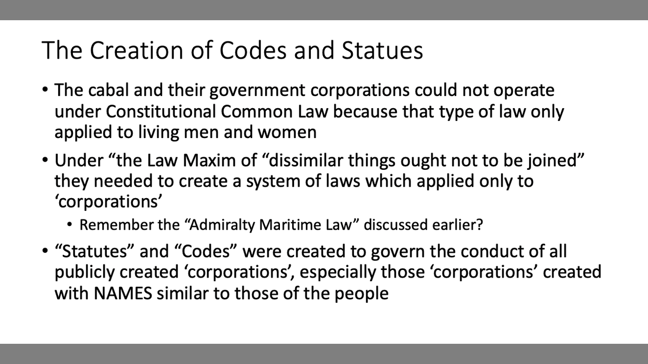 Learn about how codes and statutes are not "laws" and how they are associated with contracts and language. Learn how codes and statutes apply only to corporations and how this is related to the Birth Certificate all caps name and contracting. Learn what the 3 areas of jurisdiction are. Learn the difference between public "law" and public "policy". Learn about the UCC. Learn how are all caps name via the Birth Certificate is how the corporate governments get us all to contract with them
