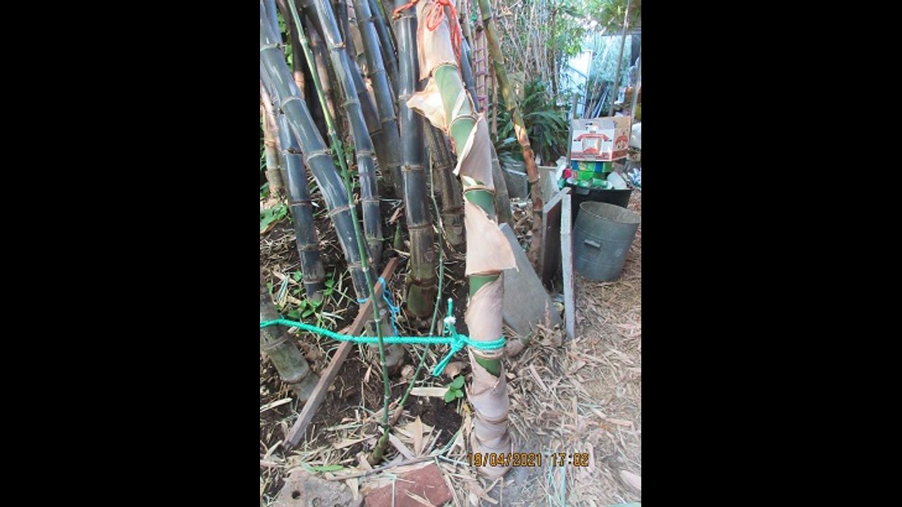 Quite often, my several species of bamboo decide to let their new season's culms head off in a direction that is not to my liking, or will lead to the culm's demise, as would occur for the culm in this video. Be on the edge of your seat day by day as I use a Spanish windlass to pull the Bambusa balcooa culm back from the eave of the house, where it would end up snapping itself from growth pressure.