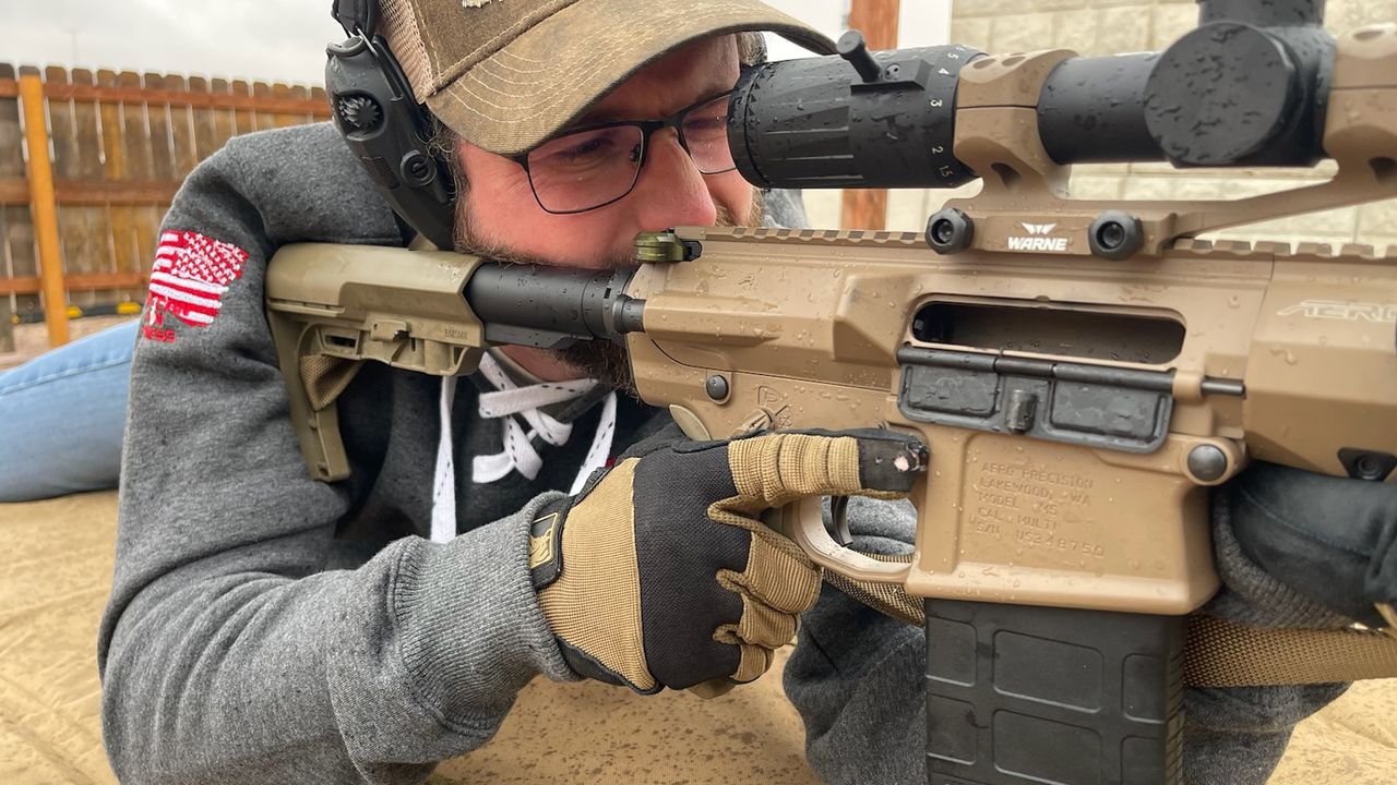 He chose an Aero Precision setup upgraded with a Geissele trigger, Battlelink buttstock, and Radian Talon 45/90 ambi safety. Aero Precision Breach Ambi charging handle is the final concession to AmbGun’s ambidextrous standards.