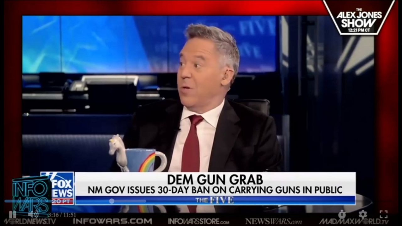 Fox News host Greg Gutfeld asked for “permission to go Alex Jones” when slamming New Mexico Gov. Michelle Grisham’s recent gun ban.