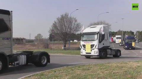 Large truck convoy rolls through Brescia, Italy to protest against high petrol prices, that have been soaring since the beginning of Russia's assault in Ukraine