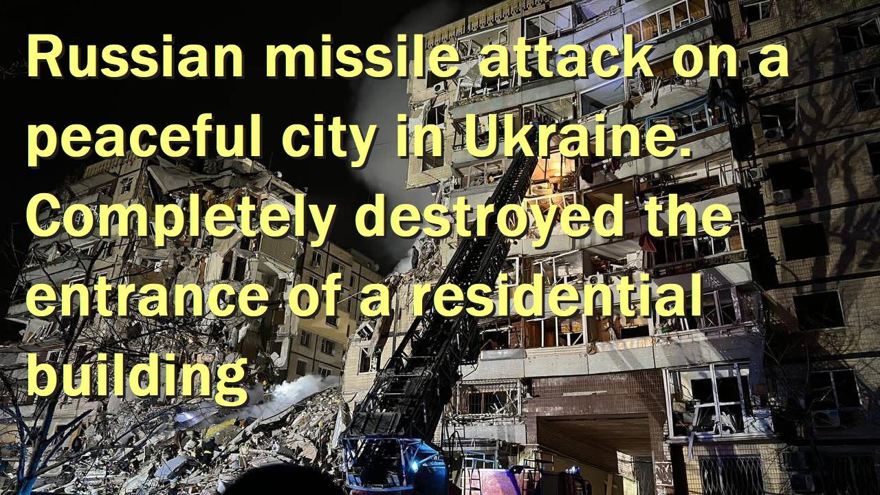 Today, January 14, 2023, the Russians launched a terrible missile attack on the city of Dnipro in the Dnipropetrovsk region of Ukraine. The consequences of the missile attack are catastrophic - the entrance of an apartment building is completely destroyed. You can hear the screams of people under the rubble.