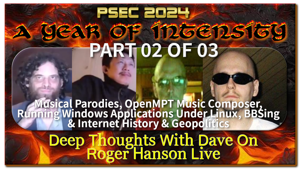 ABOUT: In this episode of "Paradigm Shift - An Educational Comedy" that we have titled as "PSEC - 2024 - Deep Thoughts With Dave On Roger Hanson Live" -- Dave Kelso appears on Roger Hanson Live with Roger Hanson, Mark Wojtaszek, Mark Edworthy and Thanh-Hai Tran. They discuss a wide variety of topics, including but not limited to Esoterics, BBSing, Internet History, Technology, Open Source Software, Open Source Music, Scamdemic, Eugenics, Musical Parodies and Hollywood Degeneracy.
