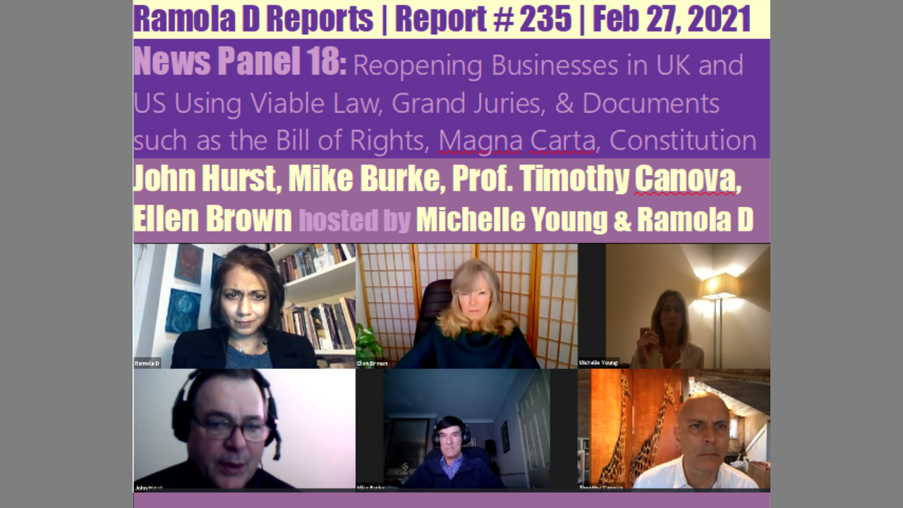 Informative and discursive conversation on the possibility of filing class action lawsuits as well as using Grand Juries in common law, and applying the Bill of Rights, Magna Carta provisions, Constitution and oaths of office to hold corrupt public officials accountable, indict them for crimes against the people, and set up new ways of addressing crime including among police departments going forward, with ex-Metropolitan Police Constable John Hurst, security and investigation specialist Mike Burke, Constitutional Law professor Tim Canova, Chair of the Public Banking Institute Ellen Brown, women's rights advocate Michelle Young, and journalist and writer Ramola D. The intent being to find ways going forward to reopen our societies in the US and UK and lawfully open businesses and society; Michelle describes her plan to save 100,000 businesses.