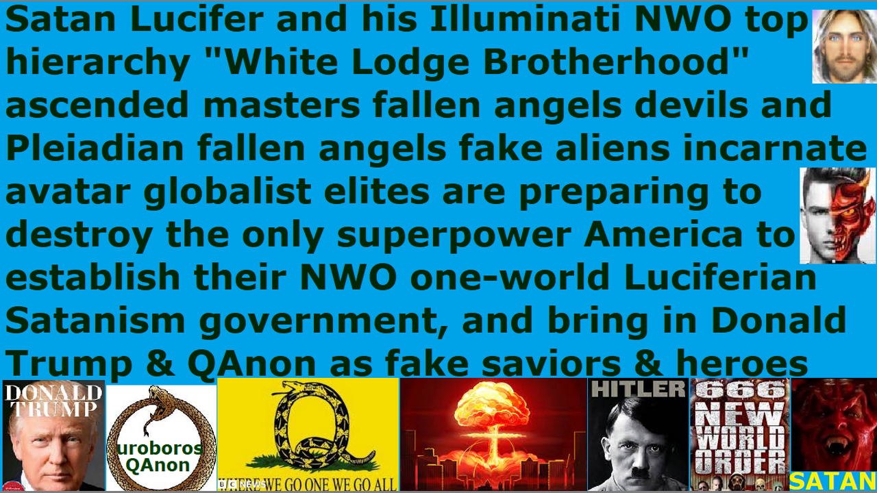 *** Intelligence news update from the Human Homo-Sapiens Race Survival Resistance (HRSR) headquarters and Republic Rebel Alliance battlefront (March 2023). Satan Lucifer and his Illuminati NWO top hierarchy “White Lodge Brotherhood” ascended masters fallen angels devils and their Pleiadian fallen angel devils Nazi fake aliens incarnate avatar globalist elites and Draco reptilian chimera Satanists fake aliens incarnate avatar globalist elites are preparing to destroy the only superpower America, in order to establish their New World Order “order out of chaos” out of their chaos from their nuclear war & biochemical weapon plagues & manufactured famines & demon armies, to have their AntiChrist bring in Donald Trump and QAnon as fake savior heroes to save humankind from the disasters that they created themselves. The people will worship the AntiChrist as their Hitler god and messiah. This is why they are making the fake clone of Donald Trump speak against their fake clone villain of Joe Biden who they will use to bring in their nuclear wars & famines & plagues, and speak against the liberal Satanists of the Dracos, in order to make them the fake villain scapegoats, while they make Donald Trump the fake hero savior of the world. They are already starting to do this with the “charismatic Adolf Hitler speeches” of Donald Trump to the dumb Western feminist nations’ religious Christian hordes and fake pastors & fake shepherds, who are redefining Bible verses and rebelling against women’s head coverings so that their heads are controlled by the fallen angels, in order to rouse them up to see him as their friend and ally and savior and hero and great enlightened illuminated one who will bring them fake peace and space fleet junk fallen angel technology and a one-world Luciferian religion under Satan Lucifer. All these “naked women’s heads, men’s pants-cross-dressers, 10% illegal tithe income tax thieves” Western feminist nations’ religious Christian hordes and fake unbiblical job position pastors of Satan Lucifer are cheering on Donald Trump’s speeches against the liberals and against the Deep State (fake façade enemy) and against the gays and against Joe Biden. It is a comedy show going on, but the “uncovered women’s heads” religious Christian hordes are getting deceived by the Draco reptilian chimera fake alien incarnate avatar Donald Trump and QAnon. Repent and receive Jesus as Savior, and make straight the way of the Lord! They do not like my daily sermon I am writing right now, so they are attacking with left shoulder blade cramp attacks and right genital pain attacks and deep sleepiness attacks and left hip socket pulling out attacks. Nothing will stop us from preaching for God’s glory, which the pastors hide and condone in silence, and we will speak out more when they attack us. End of transmission…