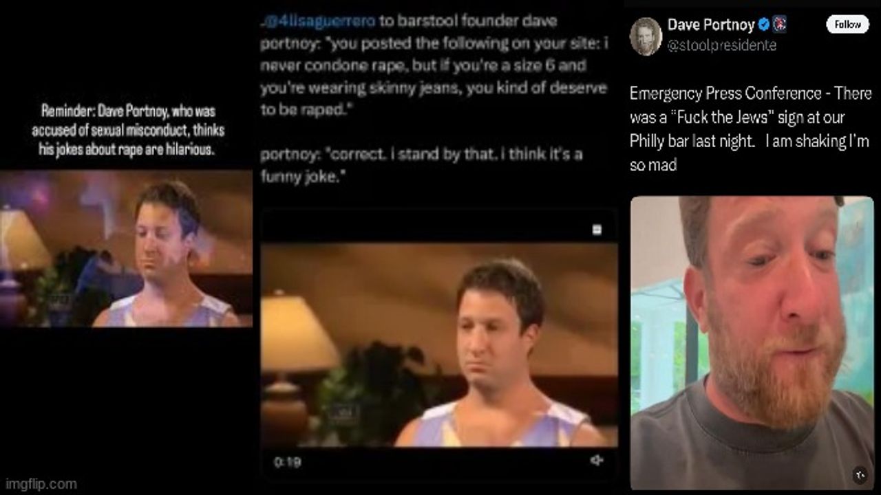 Thumbnail: https://imgflip.com/i/9wdxjo [thanks to https://www.reddit.com/r/justtrishpodcast/comments/1gvgiej/dave_portnoy_with_a_gay/ https://www.reddit.com/r/LeopardsAteMyFace/comments/1kexdzm/guy_who_promotes_the_good_people_on_both_sides/ and https://www.instagram.com/reel/DJZEY6nusxx/ 🖲]