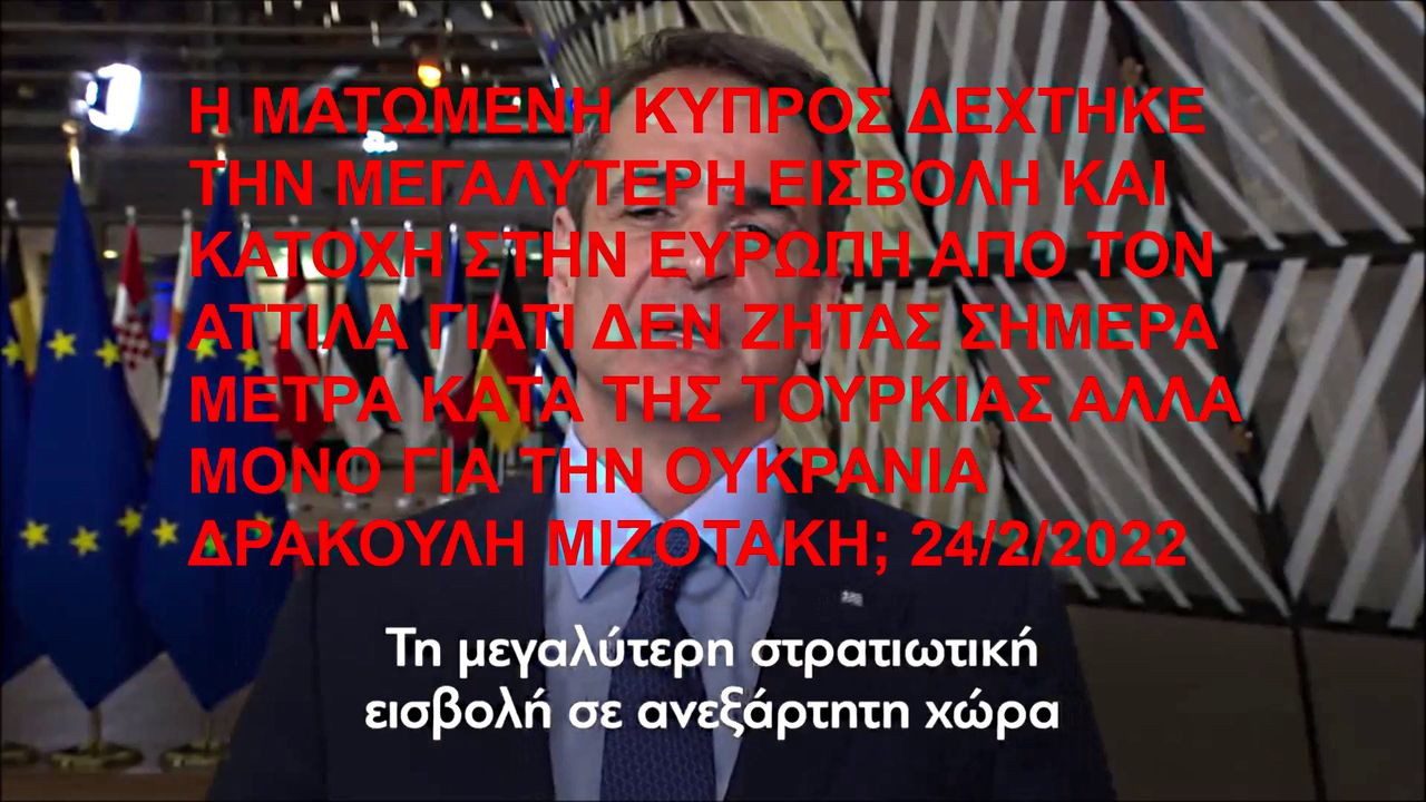 Η ΜΑΤΩΜΕΝΗ ΚΥΠΡΟΣ ΔΕΧΤΗΚΕ ΤΗΝ ΜΕΓΑΛΥΤΕΡΗ ΕΙΣΒΟΛΗ ΚΑΙ ΚΑΤΟΧΗ ΣΤΗΝ ΕΥΡΩΠΗ ΑΠΟ ΤΟΝ ΑΤΤΙΛΑ ΓΙΑΤΙ ΔΕΝ ΖΗΤΑΣ ΣΗΜΕΡΑ ΜΕΤΡΑ ΚΑΤΑ ΤΗΣ ΤΟΥΡΚΙΑΣ ΑΛΛΑ ΜΟΝΟ ΓΙΑ ΤΗΝ ΟΥΚΡΑΝΙΑ ΔΡΑΚΟΥΛΗ ΜΙΖΟΤΑΚΗ; https://ugetube.com/watch/bkHjCRwTvNlVAEe , https://rumble.com/vvx0q1-53608681.html . ΠΗΓΕΣ: https://twitter.com/PrimeministerGR/status/1496934388319363080 , https://indobserver.gr/εθνικα-θεματα/ελληνασ-πρωθυπουργοσ-αυτη-ειναι-η-μεγαλυτερη-στρατιωτικη-ειβολη-σε-ανεξαρτητο-κρατος-μετα-το-β-παγκοσμιο-πολεμο-το-1974-στην-κυπρο-τι-ειχαμε-ρε-δεν-ηταν-στρατιωτικη-εισβολη-και-κατοχη-που-παραμενει-ως-σημερα-τι-μετρα-ζητησες-κατα-της-τουρκιασ .