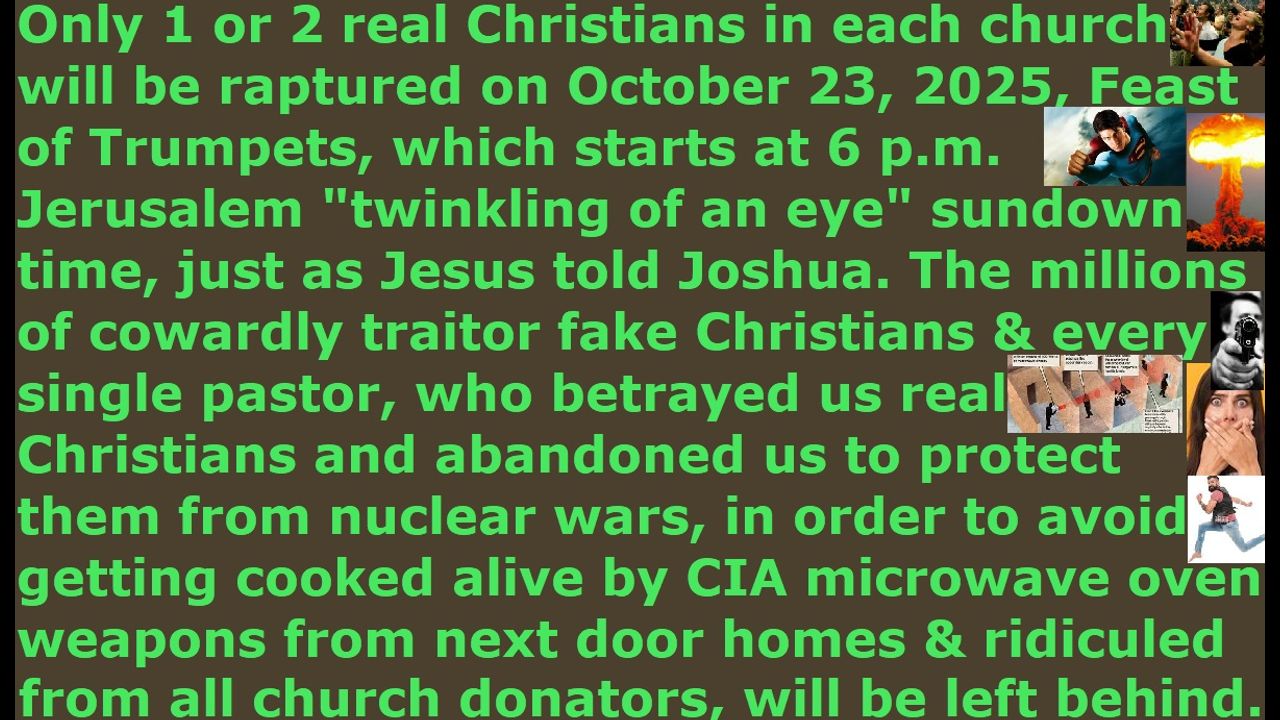 *** Intelligence news update from the Human Homo-Sapiens Race Survival Resistance (HRSR) and Republic Rebel Alliance battlefront (October 2025). Only 1 or 2 real Christians in each church will be raptured on October 23, 2025, Feast of Trumpets, which starts at 6 p.m. Jerusalem "twinkling of an eye" sundown time, just as Jesus told Joshua. The millions of cowardly traitor fake Christians & every single pastor, who betrayed us real Christians and abandoned us to protect them from nuclear wars, in order to avoid getting cooked alive by CIA microwave oven weapons from next door homes & every hotel room and to avoid getting ridiculed from all church donators, will be left behind for the 7-year Tribulation Age judgment. Usually, there are many “rapture worshipper” proud “self-attention loving” partier fake Christians publishing YouTube videos during each “Feast of Trumpets” day every year predicting that the rapture is going to happen, so that they can take credit & boast about it, later. However, this year, all of them seemed to have been silenced by God, because God used Joshua to announce it himself that September 23-24, 2025 was going to be the rapture date. All these masses of fake Christian “rapture predictor” boasters, who claim to know the rapture date, disappeared into silence & hiding & fear & cowardice and avoided any association with Joshua & Jesus who predicted this year’s Feast of Trumpets as the rapture date, because they did not want to receive the mocking & scoffing from the millions of Satan Lucifer’s Draco reptilian chimera fake alien incarnate avatar pedophile cannibal Satanist LGBTPB (lesbian gay bisexual transvestite pedophile bestiality) globalist elite feminist witch fake Christian criticizers & blamers & accusers & internet trolls & revilers & cursers. It is kind of hilarious when you think about it. Now that it is October 20, 2025, the only people, who are still supporting Joshua & Jesus and standing by the Feast of Trumpets rapture date prediction with faith & love & righteousness & loyalty & devotion & trust in God are the real Christians, who never made YouTube videos in their entire lifetime, and who hate receiving public attention to themselves, and who do not like going on videos, but they did take the risk of testifying of God’s confirmation of the rapture date, because they were commanded by God and loved God. The usual multitudes of “rapture date setter” annual partiers fake Christians, who come out to make thousands of videos every year always claiming that “this year’s Feast of Trumpets is going to be the rapture date,” now think that we real Christians are crazy “Beelzebub demon-possessed” heretic idiot lunatic maniacs who love mocking & scoffing & reputation suicide, because we are claiming that Jesus meant that the September 23-24, 2025 rapture date is October 23-24, 2025 at 6 p.m. sundown in Jerusalem at the last rays of sun “twinkling of an eye” where the Feast of Trumpet begins, because “septem” means the seventh month of Tishri in God’s Hebrew calendar, which starts on October 23 sundown 6 pm this year, because the Feast of Trumpets was delayed by a month due to the barley harvest being not yet “aviv” ripe by the spring equinox for the Passover “omer” bread offering, and the September 23-24, 2025 date was not yet the autumn equinox since the Feast of Trumpets has to be in the autumn and not summer. God has miraculous ways of silencing the boasting partying attention-loving fake Christians, and making the real Christians, who do not like attention and who are humble and who usually remain silent away from public view, come out in loving obedience to publicly continue to support a Christian brother Joshua and Jesus about the September 23-24, 2025 rapture date prediction, even when it is now a month past what the fake Christians thought the phrase “September 23-24” meant, and we are now in October 20, 2025.