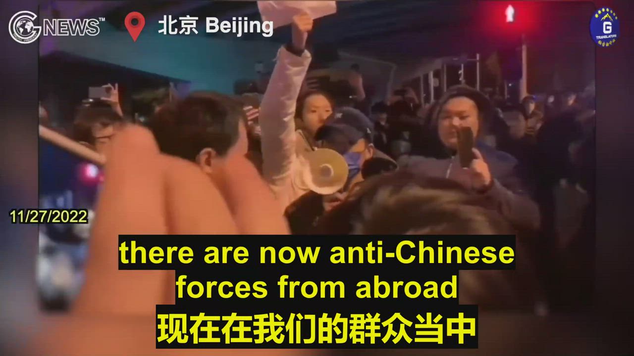 Summary:11/27/2022 At Liangmaqiao in Beijing, people gathered to protest against the extreme COVID lock downs imposed by the Chinese Communist Party authorities, and someone in the crowd claimed that there were \"foreign forces\" there, which was refuted by the crowd.