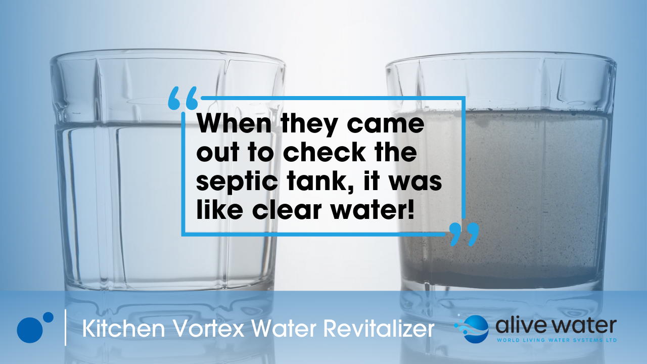 In this video, customer Barbara, gives her testimonial on her crystal clear water revitalized septic tank and her neighbors dramatic before and after water clarity using the Kitchen Vortex Water Revitalizer.
