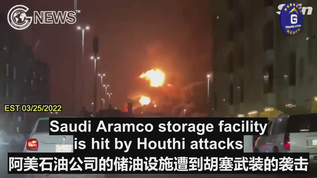 03/25/2022 DRAMATIC footage shows a HUGE explosion in Jeddah as ‘Saudi Aramco storage facility is hit by Houthi attacks’ according to reports.
