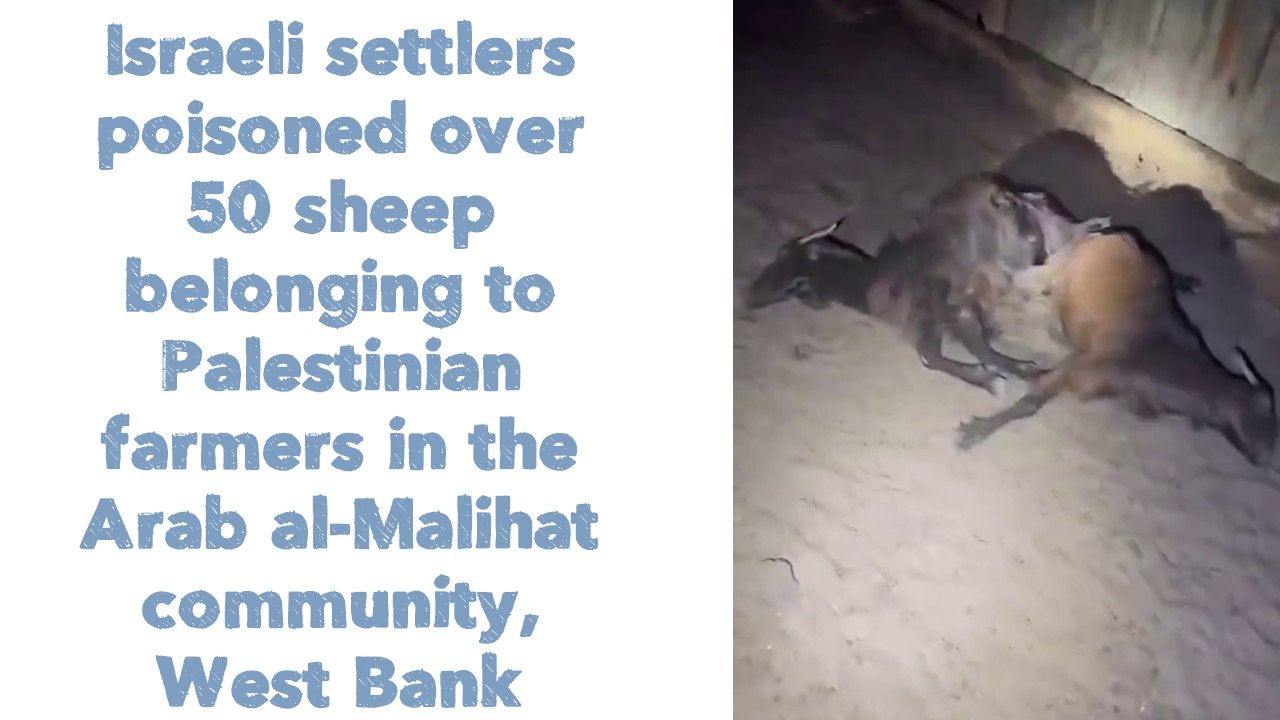 Israeli settlers poisoned over 50 sheep belonging to Palestinian farmers in the Arab al-Malihat community, West Bank