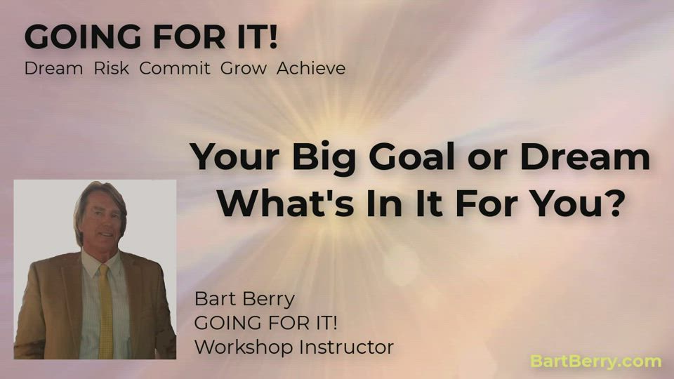 Identify and tap into the tangible and intangible motivations for achieving your biggest goals and dreams. Excerpts from "GOING FOR IT! Dream Risk Commit Grow Achieve" Online Personal Achievement Workshop By Bart Berry. Learn More at: https://www.bartberry.com/going-for-it-online-course