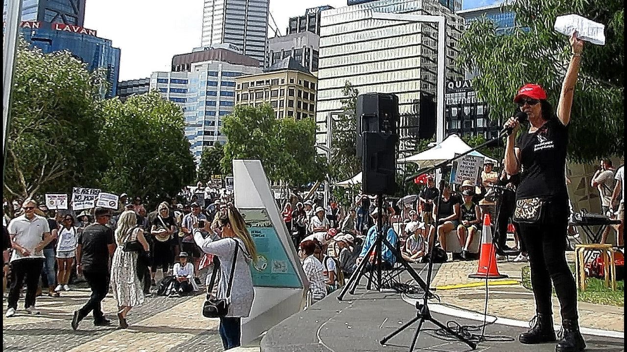 Two starting points today from 3 p.m.: Elizabeth Quay and Supreme Court Gardens. The combined crowd was the large, the biggest I have attended this year, although I think I missed a larger one due to ill health. The camaraderie of everyone present was wonderful, the speeches great, and the support for one another due to the trauma being inflicted upon us was high. Our Premier, Mark McGowan’s behaviour and actions are becoming increasingly despised, and he should immediately do a 180 degree turn, apologise, and begin to repair the incalculable damage he has done. Like all other official Australian figures featured through mainstream media, he is doing Hitler proud, and every other callous brutal dictator throughout history. Now he comes for our children… God help him when the swelling fury of the awakened and the awakening explodes.