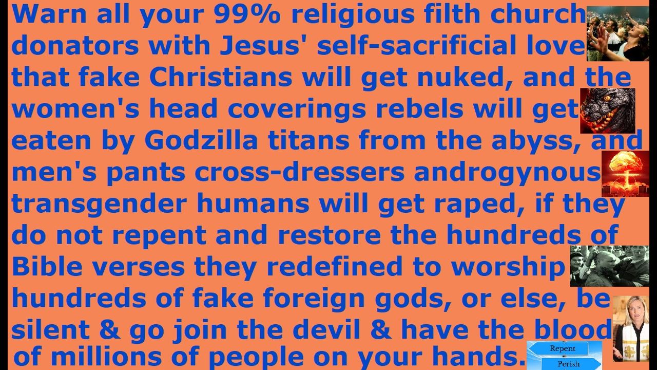 *** Intelligence news update from the Human Homo-Sapiens Race Survival Resistance (HRSR) headquarters and Republic Rebel Alliance battlefront (May 2025). Warn all your 99% religious filth church donators with Jesus' self-sacrificial love that fake Christians will get nuked, and the women's head coverings rebels will get eaten by Godzilla titans from the abyss, and men's pants cross-dressers androgynous transgender humans will get raped, if they do not repent and restore the hundreds of Bible verses they redefined to worship hundreds of fake foreign gods, or else, be silent & go join the devil & have the blood of millions of people on your hands. A child resembles its father, and that is why the pastors do what their father the devil does. The devil & his fallen angels are parasites, who feed on the human soul energy of 12 million sacrificed children and the millions killed in their wars and all of history’s recorded & unrecorded war crimes (some of which they boasted to me in their messages to me) & horrendous human experimentations & cannibalism, and likewise like father & son, the fake unbiblical job position pastors extort using God’s name to feed on the illegal tithe income tax they parasite from the 99% religious filth church donators they filled God’s house with by redefining hundreds of Bible verses for their hundreds of fake foreign gods. Both are parasites. Likewise, just as God gave his Son, and Jesus gave his life for the world with his self-sacrificial love to buy back his children, so also we real Christians have sacrificed our daily lives and all our savings and all our possessions that could be sold and our families & friends and our jobs and our careers and our retirement pensions and our reputations and our comfort away from assassination attempts and comfort away from ridicule by all church donators and everything for God and for the millions of fake Christians & every single pastor who betrayed us like a family dog. A gracious giving father has a gracious giving child, and a parasite father has a parasite child. God raises kings & priests, while a parasite leech gives birth to baby leeches. By their fruits you will know what tree they are, and by their actions you will know which god they are a child of. Preach this in your next Sunday church service sermon, so that all your church member witch assassins will try to assassinate you and slaughter your genetic descendant idols, and 99% of your church donators will leave your church in disgust & anger & sheer terror, so that God’s house will be cleansed of their religious filth. Do it now and do not wait until tomorrow, unless you are a crazy lunatic who has lost all common sense of the Holy Spirit. Jesus died on the cross to atone for your sins, and he rose again, and he is seated on his throne in heaven reigning, so that whoever repents and receives him as Savior & Lord will receive forgiveness for sins and the gift of eternal life. Salvation is by free grace and faith in the atoning blood of Jesus, and not by wearing women's head coverings or abstaining from cross-dressing in men's pants or abstaining from extorting fake illegal tithe income tax. Repent and receive Jesus as Savior, and make straight the way of the Lord!