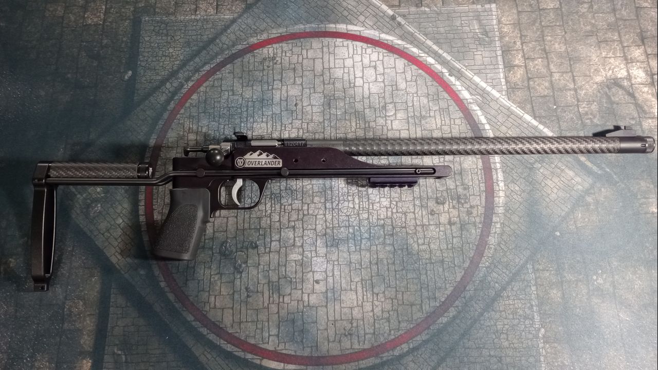 The light, carbon fiber wrapped barrel, free floated “handguard”, pistol grip, and collapsible buttstock lend the Overlander an exotic look.