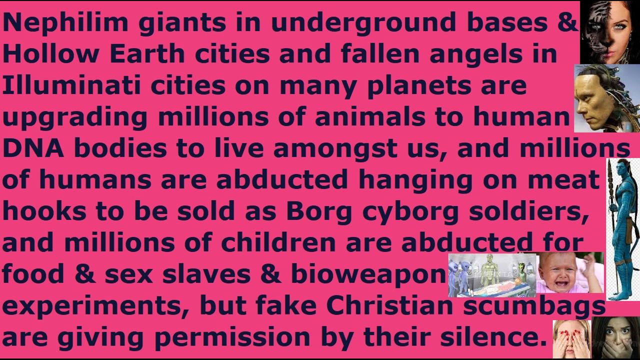 *** Intelligence news update from the Human Homo-Sapiens Race Survival Resistance (HRSR) headquarters and Republic Rebel Alliance battlefront (June 2024). Nephilim giants in underground bases & Hollow Earth cities and fallen angels in Illuminati cities on many planets are upgrading millions of animals to human DNA bodies to live amongst us and to replace humans, and millions of humans are being abducted and hung on meat hooks to be sold as Borg cyborg soldiers to thousands of fake alien species, and millions of children are being abducted for human meat food & child sex slaves & bioweapon experiment test subjects and DNA organ harvesting products, but the “naked women’s heads, men’s pants cross-dressers androgynous transgender” fake Christian scumbags are giving permission to all these things and tens of thousands of other things we real Christians shared to them by their silence, because of their fear of assassination attempts by their church member witch assassins and ridicule from church donators and getting cooked alive by CIA microwave oven weapons from next door homes & every hotel room. This is why these fake Christians and these Nicolaitan clergy class laity class Satanist pagan religious system’s “ordained & allowed & trained & non-assassination-attempts-receiving” fake unbiblical job position pastors watch their fellow church donators eat their own 12 million kidnapped children’s leftover human meat & bone ashes in their church member witch assassins’ church food. The blood of 6 billion people and their church donators will be on their hands. Silence is condoning evil and giving permission to Satan Lucifer. They need human authority to do what they are doing. Even worse, these fake Christians have the audacity to bring greater judgment upon themselves by insulting God by trying to appease both Satan Lucifer & God by modifying & diluting & sterilizing & picking & choosing & editing the tens of thousands of truths we real Christians shared to them in our daily sermons for decades, in order to make it safe for themselves from assassination attempts and ridicule from church donators, so that they can sabotage God’s truths and destroy our real Christians’ ministries and cover-up Satan Lucifer and mislead millions of people to hell & false realities & false understandings & false complacencies & false political/social solutions. The worst sly conniving fake Christians are those who pretend that they do not have the Holy Spirit's discernment of the truth, in order to use that as an excuse to remain silent to condone all the evils. They are also the tens of thousands of fake Christians and every single pastor, who betrayed us real Christians and threw us out to the Illuminati wolves and abandoned us to fight alone by myself against the millions of assassins & world elites & their militaries & their governments & their space fleets & Draco Empire & fallen angels & Satan Lucifer, in order to protect them and their families and the human specie and humanoids and allies and the earth and the women & children. We real Christians and God’s Holy Spirit in us is stopping them from exterminating the human specie, so that is why they are trying to kill us every day and trying to starve us off and killing our heathen families. When they attack us, they get destroyed instead, just as the Word of God says. Preach this in your next Sunday church service sermon, so that 99% of your church donators will leave your church in anger & terror & disgust, so that God’s house will be cleansed of their religious filth. Do it now and do not wait until tomorrow, unless you are a crazy lunatic who has lost all common sense of the Holy Spirit. Jesus died on the cross to atone for your sins, and he rose again, and he is seated on his throne in heaven reigning, so that whoever repents and receives him as Savior & Lord will receive forgiveness for sins and the gift of eternal life.