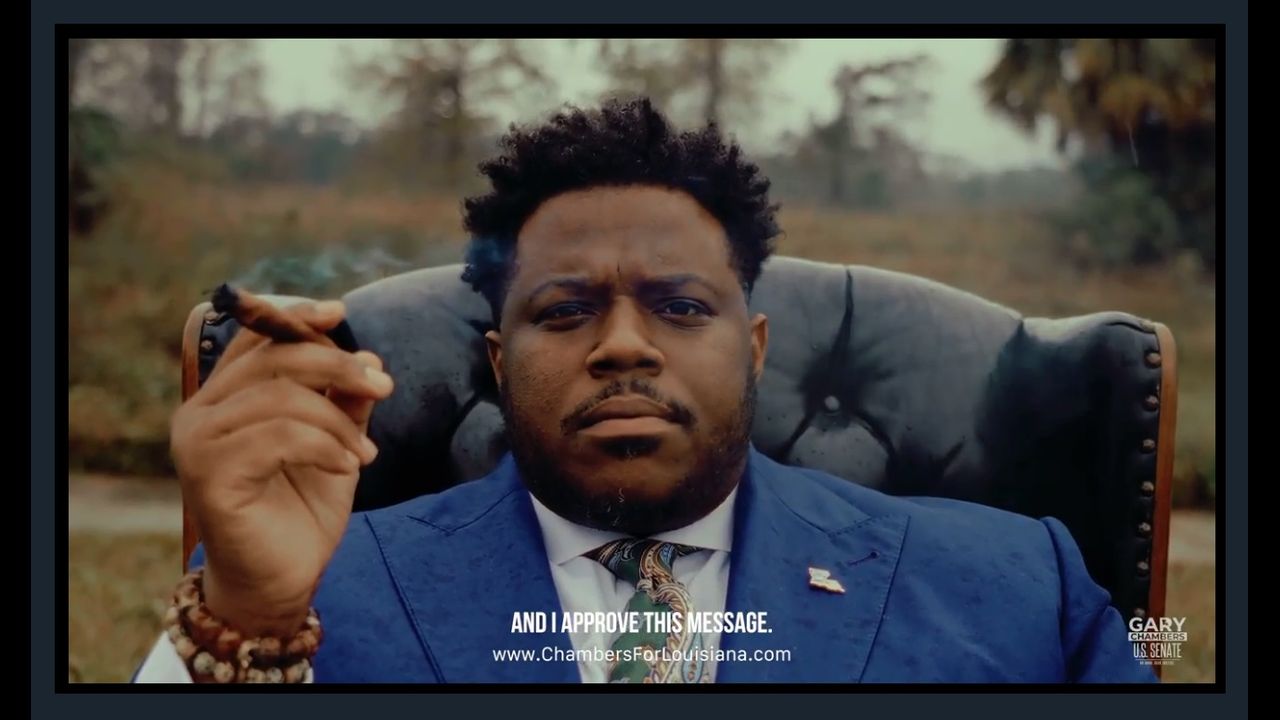Chambers, who seeks to upset Republican Sen. John Kennedy, is featured in the new commercial that portrays him sitting in an open field and lighting up, taking in multiple puffs as he speaks in his video entitled “37 Seconds.”