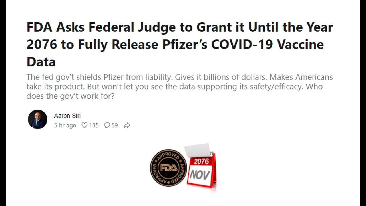 FDA Asks Federal Judge to Grant it Until the Year 2076 to Fully Release Pfizer’s COVID-19 Vaccine Data