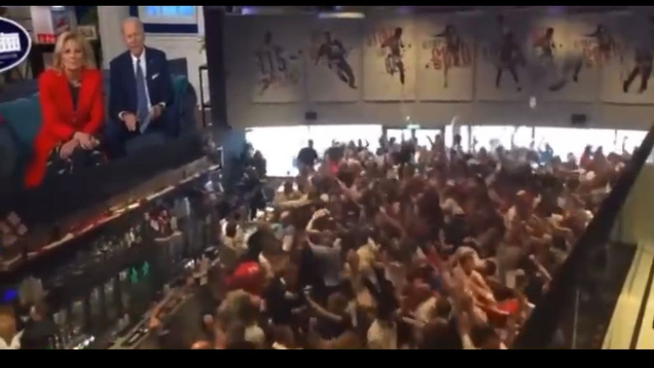 Biden gets pranked into saying let’s go Brandon. Call, White House, Bar crowd cheering. Good fun