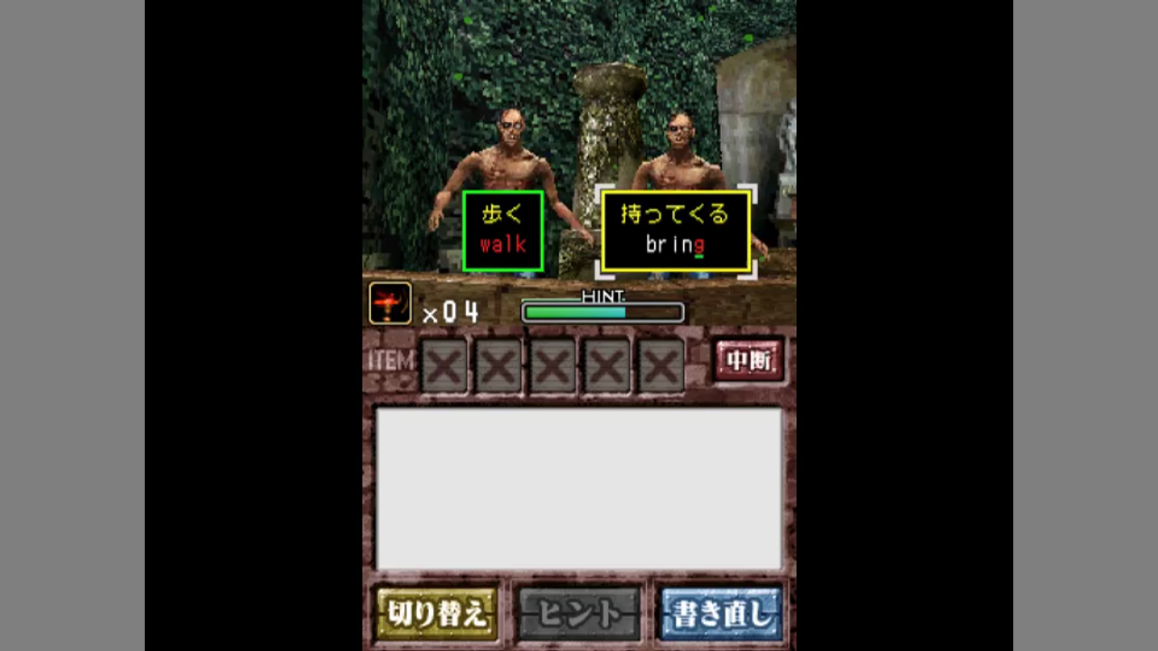 English of the Dead is another educational spin-off to Sega's House of the Dead series, like Typing of the Dead before. English of the Dead is a game to learn English vocabulary. It is based on House of the Dead 2 and you go through basically the same story and levels. Instead of shooting the zombies directly, you need to spell out English words displayed over zombies and other enemies. You need to write the word down with the stylus, letter by letter. Each correct letter will make your character shoot the enemy, completing the word will defeat it. Sometimes characters are missing, so you need know these or deduce them from the audio, as the words are also read out loud. If you are too slow, an enemy will hit you. Like in the regular House of the Dead games, you only got a limited number of lives, and it's game over if you loose all. Solving problems fast and without errors will give you bonus items or new lives. There is also a hint gauge which fill with correct answers. You can use a hint function to skip letters as long as the gauge is not empty.