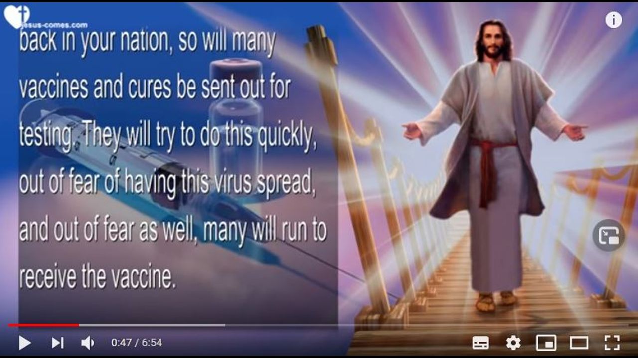 (Jesus) "My people, please heed this warning. As the lo..down will be rolled back in your nation, so will many va..ines and cures be sent out for testing. They will try to do this quickly, out of fear of having this virus spread, and out of fear as well, many will run to receive the va..ine.