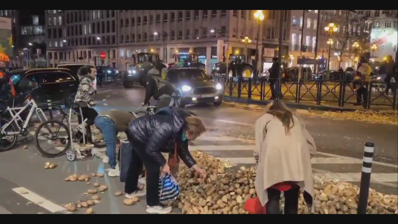 Brussels streets flooded with potatoes after farmers protest – but locals gather up the unexpected harvest.