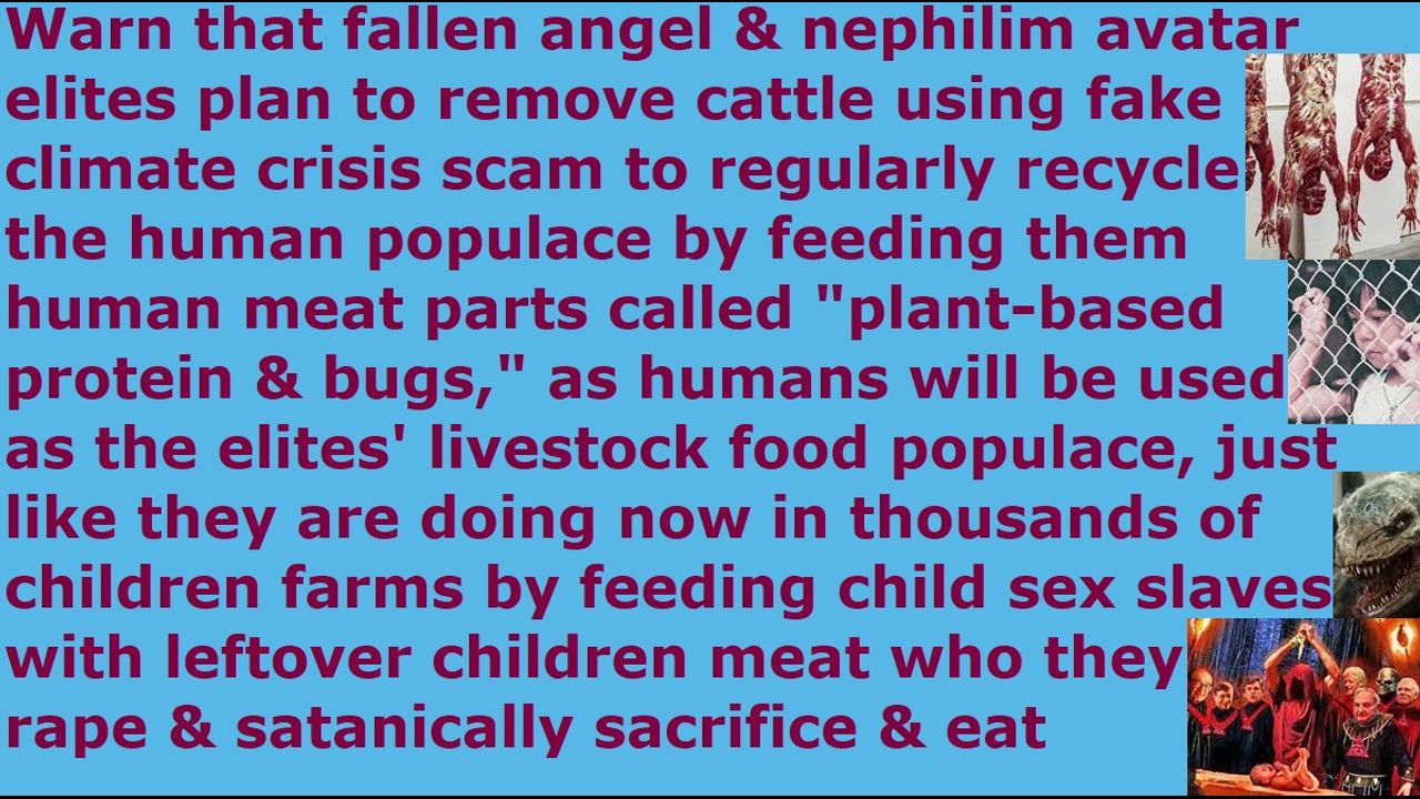 *** Intelligence news update from the Human Homo-Sapiens Race Survival Resistance (HRSR) headquarters and Republic Rebel Alliance battlefront (February 2024). Warn all your church donators and 6 billion humans that the fallen angel & reptilian nephilim incarnate avatar elites are planning to remove all cattle and meat sources using their fake climate crisis scam carbon taxation, in order to regularly recycle the human specie populace by feeding them leftover human meat parts called "plant-based protein & bugs," as humans will be used as the elites' livestock food populace in the future world, just like they are already doing now in thousands of children farms by feeding their millions of child sex slaves with the leftover children’s human meat & bone ashes who they rape & satanically sacrifice & eat and torture for adrenochrome blood, and the 12 million kidnapped children’s human meat & bone ashes in the supermarket groceries & church food & fast food. Or else, go join the devil already. The Western feminist nations’ “naked women’s heads, men’s pants cross-dressers androgynous transgender” fake Christians are hiding all of this truth from the populace, so the blood of all these children and future humans are on their hands. Even worse judgment awaits those who are modifying & diluting & sterilizing & picking & choosing & editing the tens of thousands of truths we real Christians shared and warned them in our daily sermons for decades, in order to sabotage the real truths & full truth to make it safe for themselves from assassination attempts and ridicule from church donators and to make the truths palatable & acceptable to their 99% religious filth church donators. Preach this in your next Sunday church service sermon, so that 99% of your church donators will leave your church in anger & terror & disgust, so that God’s house will be cleansed of their religious filth. Do it now and do not wait until tomorrow, unless you are a crazy lunatic who has lost all common sense of the Holy Spirit. Jesus died on the cross to atone for your sins, and he rose again, and he is seated on his throne in heaven reigning, so that whoever repents and receives him as Savior & Lord will receive forgiveness for sins and the gift of eternal life. Salvation is by free grace and faith in the atoning blood of Jesus, and not by wearing women's head coverings or abstaining from cross-dressing in men's pants or abstaining from extorting fake illegal tithe income tax. Repent and receive Jesus as Savior, and make straight the way of the Lord! End of transmission…