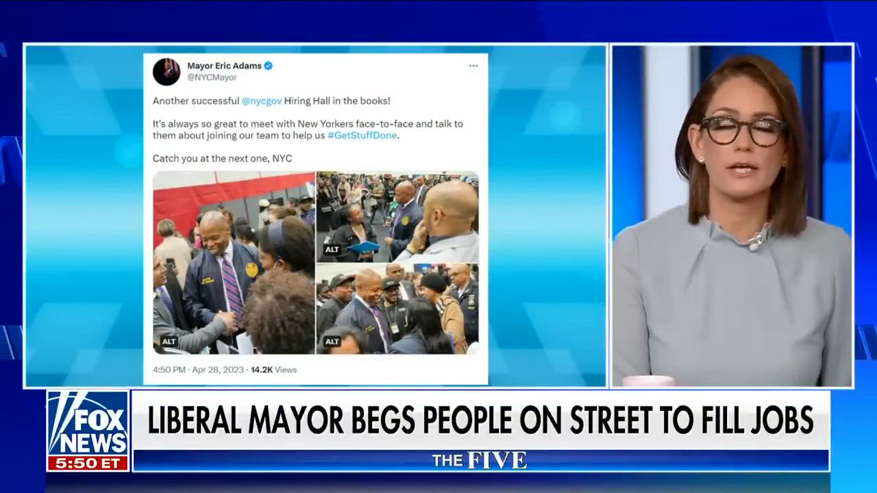 ‘The Five’ co-hosts discuss how liberal mayor Eric Adams took to New York City's streets to ask people to fill job vacancies. #foxnews #fox #thefive