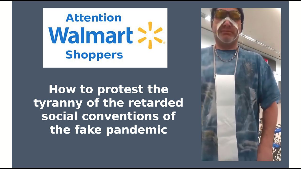 A Walmart shopper provides a stellar example to the sheeple of how to properly protest the tyranny of the retarded social conventions of the fake pandemic. Be an example of the resistance! Baa-baaaa sheeple!
