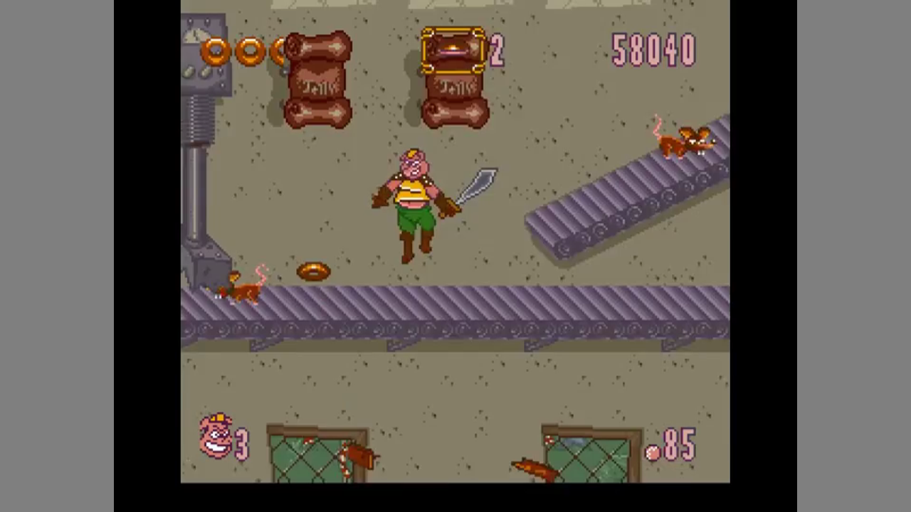You can jump and slash with your sword, as well as use various kinds of doughnuts as projectiles. There are also crates which can be smashed by butt-stomping them. The crates contain either doughnuts or health items (also doughnuts).