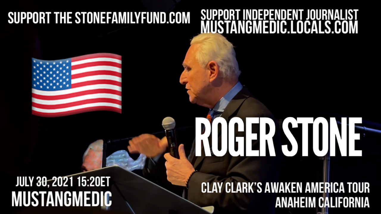 Roger Stone addressing the audience at Clay Clark’s Reawaken America tour