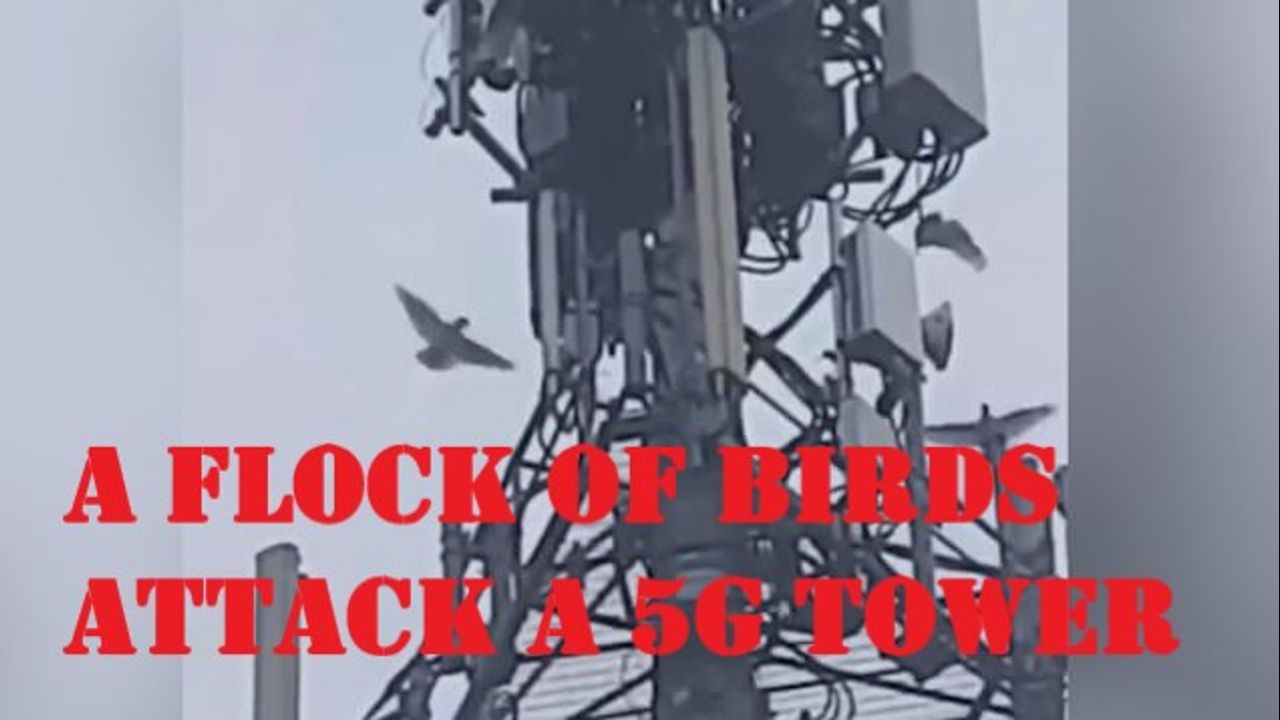 A flock of birds attack a 5G tower by ripping out wires with their beaks